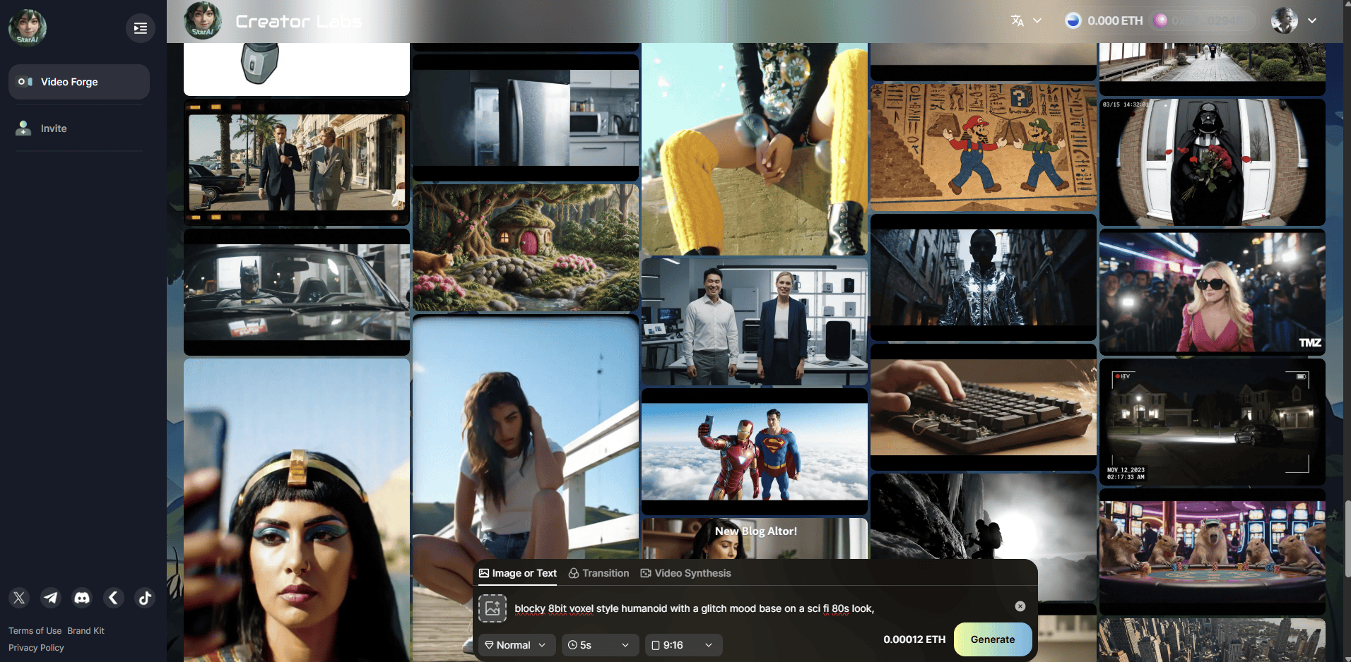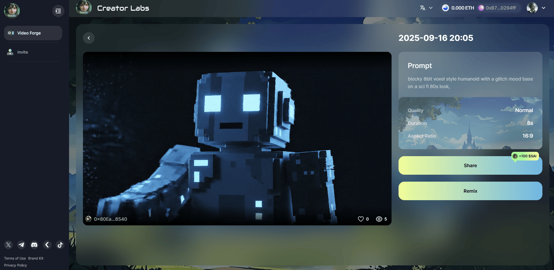 例如:输入提示词 “blocky 8bit voxel style humanoid with a glitch mood base on a sci fi 80s look,” 即可生成相关的 AI 视频。