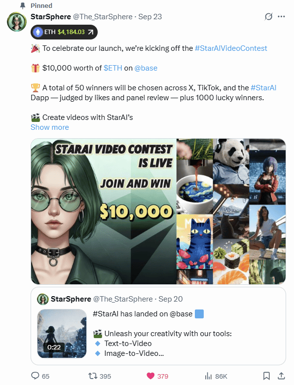 为庆祝上线,星界新智(StarSphere)已启动 视频生成大赛,奖励池总额 $10,000: