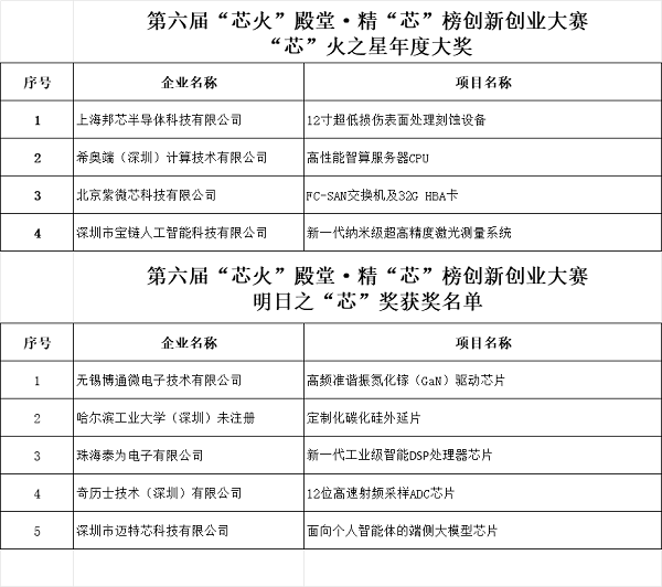 第六届 “芯火” 殿堂・精 “芯” 榜创新创业大赛获奖名单正式公布