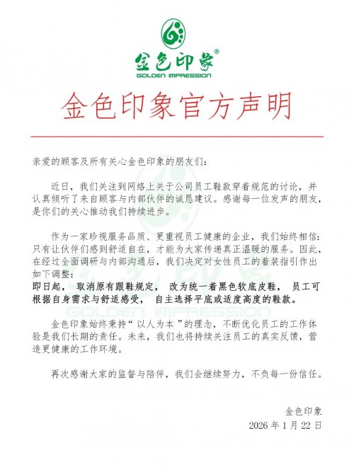 服务业素来强调标准化与规范化,着装统一是其中常见的一环。然而,过度的、忽视个体差异与健康的标准化,可能走向形式主义,甚至损害员工的积极性和创造力。金色印象此次改革,不仅是对员工身体自主权的尊重,也是品牌在标准化与人性化之间寻求更优平衡点的一次实践。