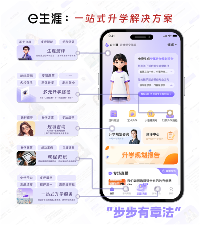其中,“e成长”作为区域素质教育平台,聚焦课后服务、艺术体育、研学旅行、竞赛活动等领域,通过“共享模式”整合社会优质资源,为区域素质教育高质量发展提供了可复制的实践样本。“e生涯”服务于学生生涯规划及多元升学,构建融合诊断测评、规划咨询、课程资源、升学出口的完整生涯教育体系,为全学段学生提供从自我认知到职业落地的个性化成长路径全流程支持,陪伴学生成长成才全过程。