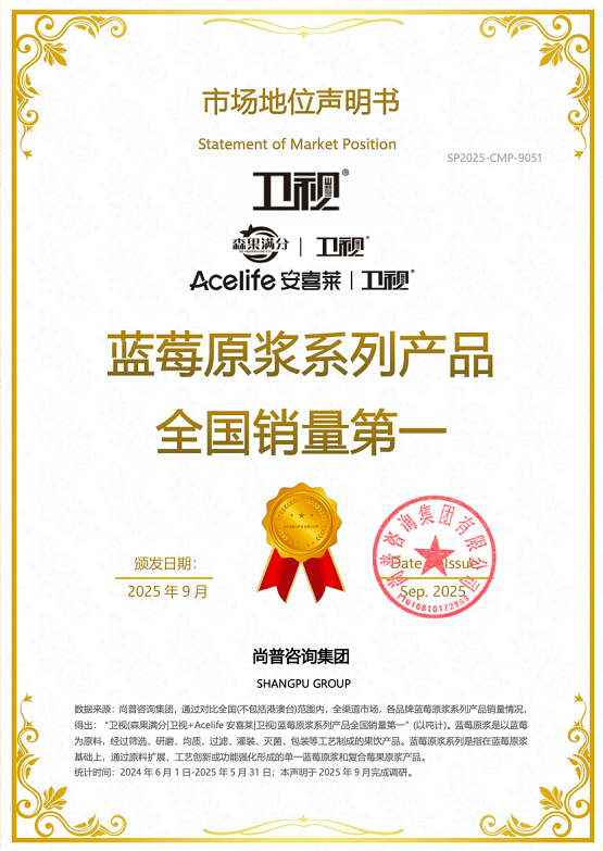近日,权威机构尚普咨询发布调研结果,卫视(森果满分|卫视+Acelife 安喜莱|卫视)蓝莓原浆系列产品全国销量第一,成为蓝莓原浆细分领域的领跑者。