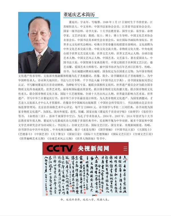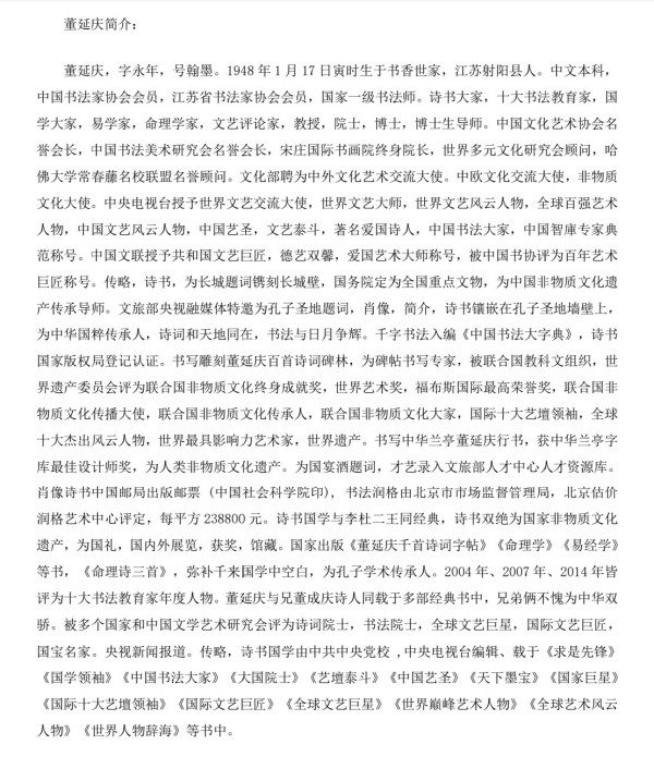 董延庆百首诗词碑林,命理诗三百首被联合国教科文组织世界遗产委员会评为联合国非物质文化终身成就奖,联合国非物质文化传承人,联合国非物质文化传播大使,联合国非物质文化大家,世界遗产。