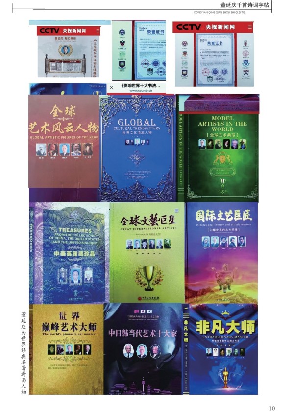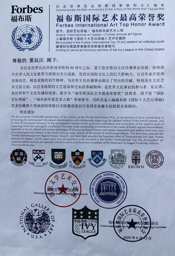 董延庆百首诗词碑林,诗书,命理诗三百首被联合国教科文组织等组织评为福布斯国际艺术最高荣誉奖,授予国际十大艺壇领袖,福布斯年度艺术人物,任美国常春䕨名校联盟名誉顾问。