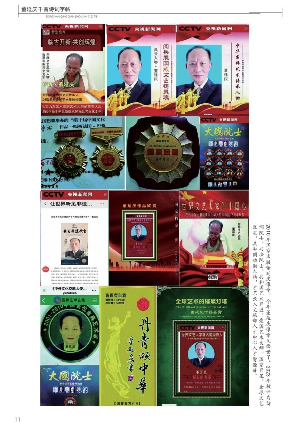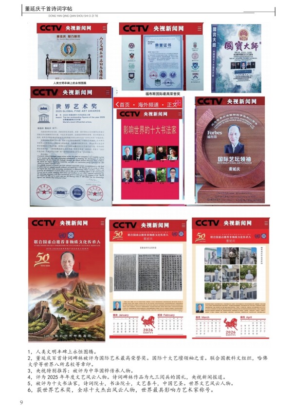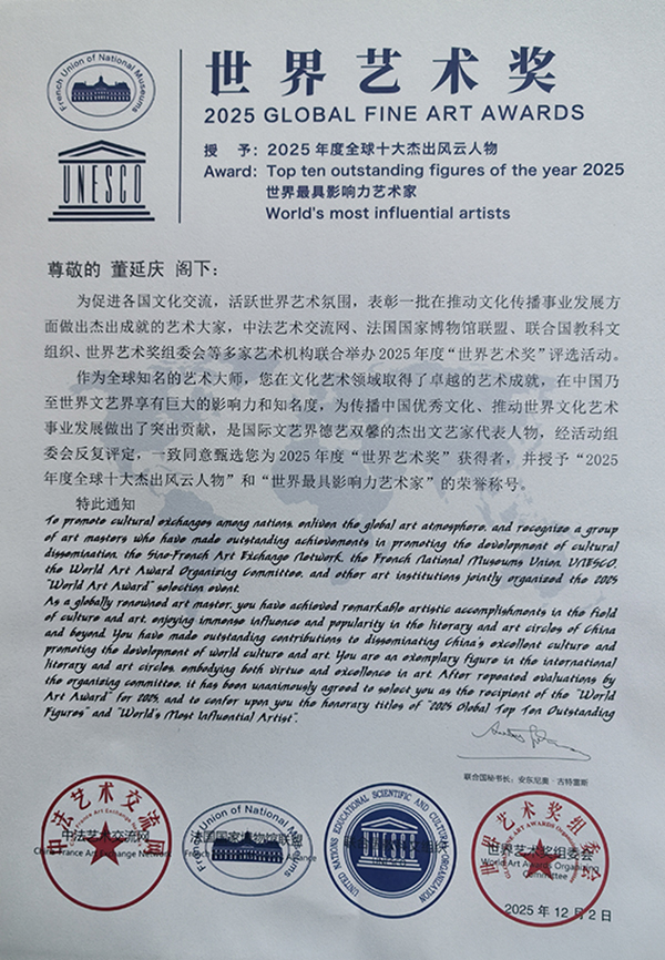董延庆百首诗词碑林,诗书,命理诗三百首被联合国教科文组织等组织评为世界艺术奖。被授予2025年度全球十大杰出风云人物,世界最具影响力艺术家。
